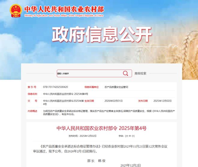 2025年12月2日,农业农村部部长韩俊签发2025年